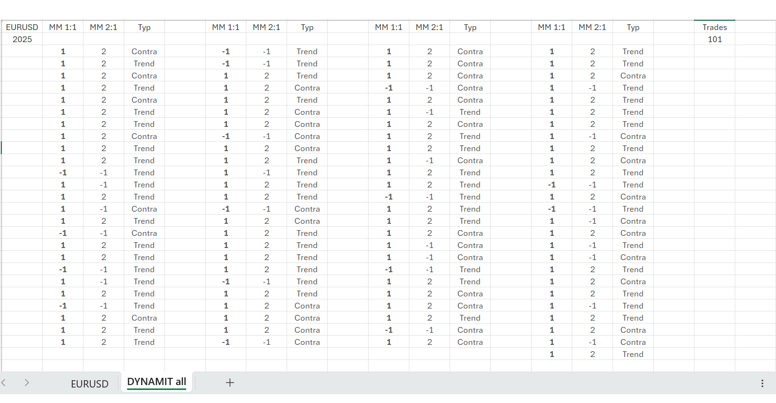 Data výše zobrazují obchody na EURUSD 2025, které si projdeme. Jedná se o naprosto všechny vstupy, které na tomto páru v tomto roce byly (zcela všechny od nejslabších po nejsilnější).